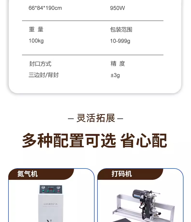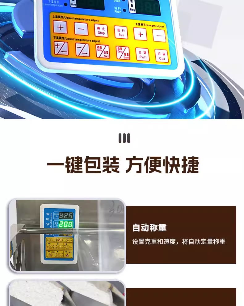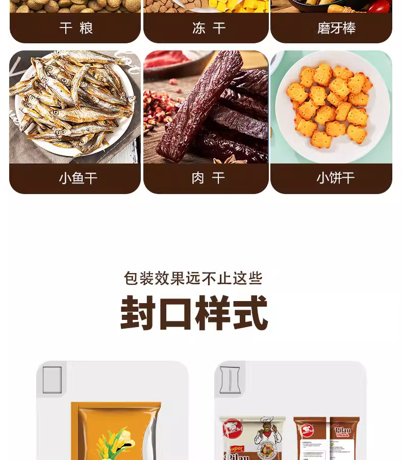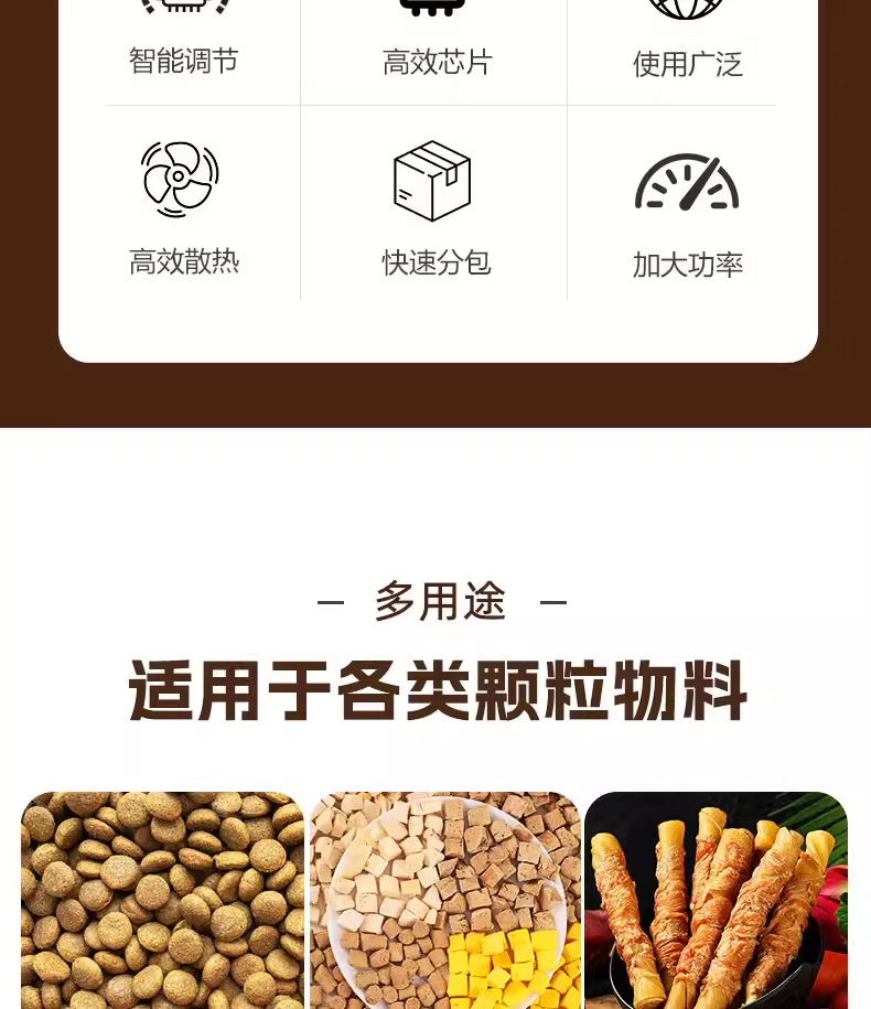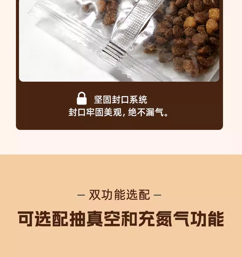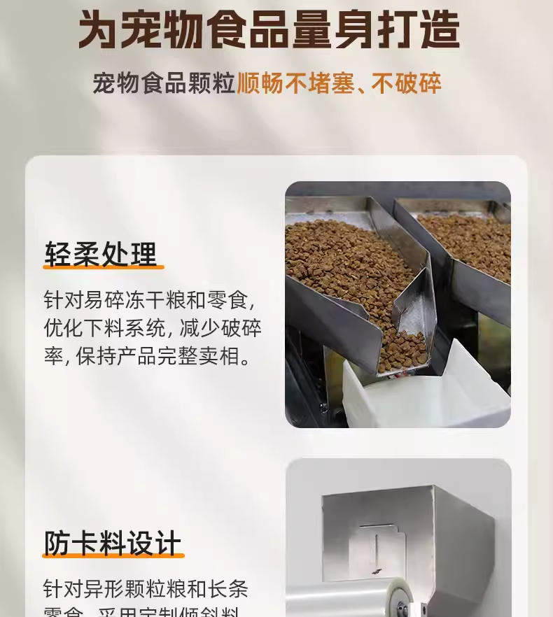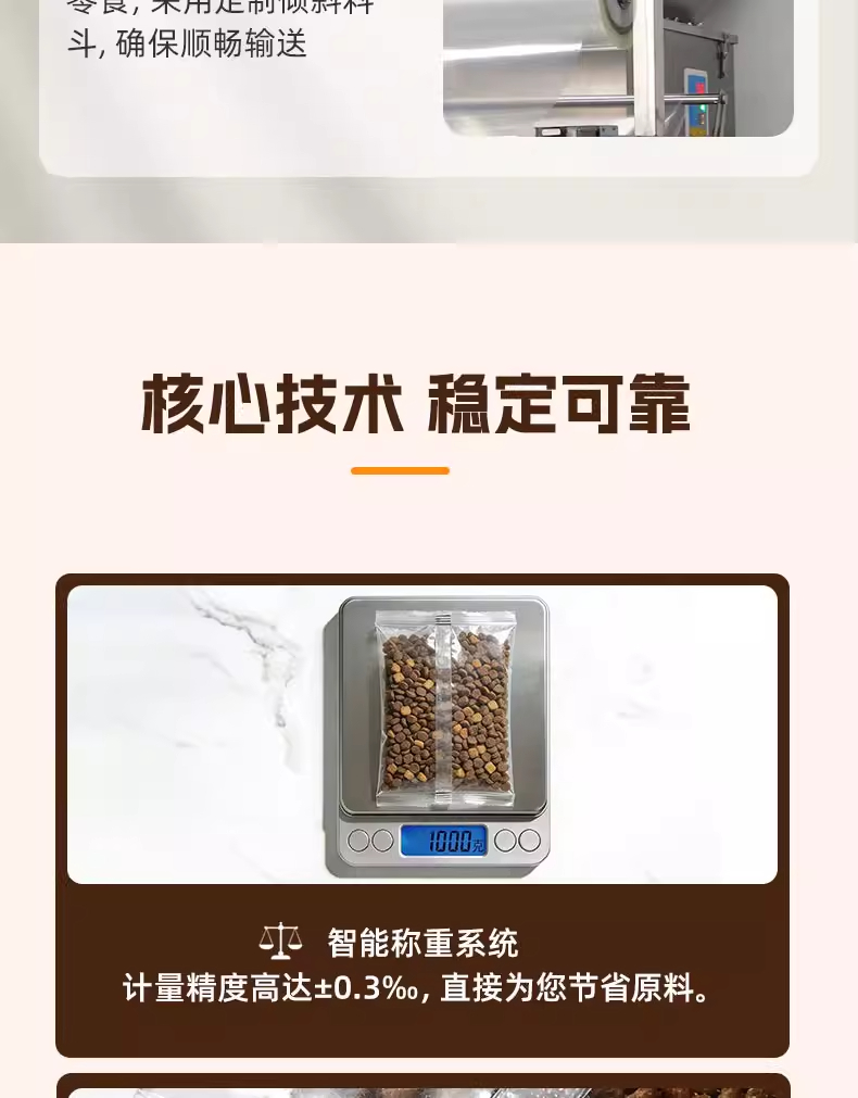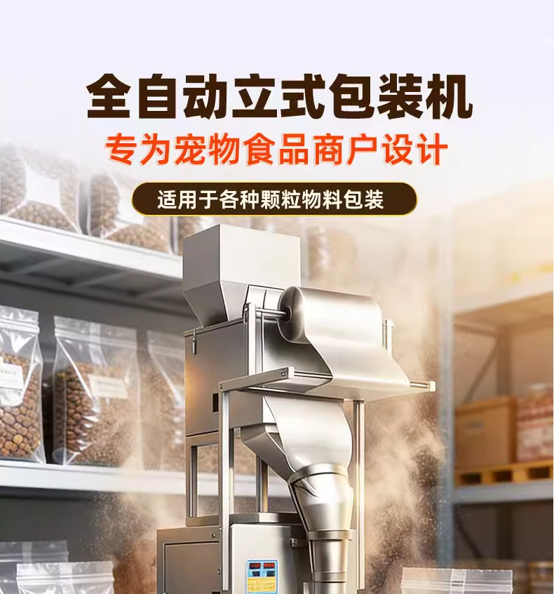 捷鼎生产的999克电动大型包装机,适用于:猫粮、狗粮、干粮、冻干粮、咬咬棒、肉干、小饼干、磨牙棒、小鱼干、肉干、冻干生肉等宠物食品及其他颗粒、粉末的定量、称重、填充、封口等操作。