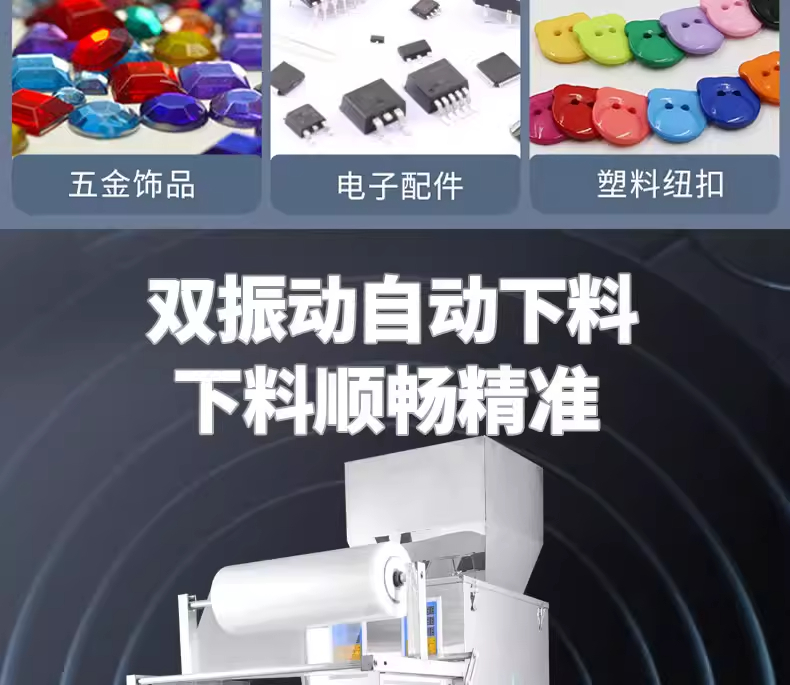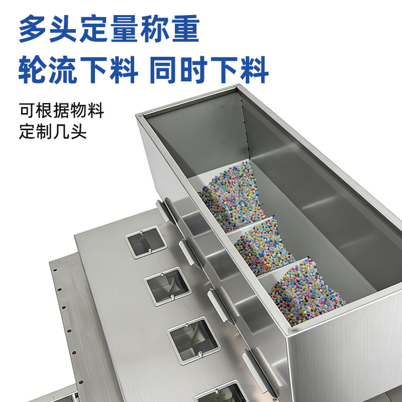 捷鼎生产的4头100g颗粒粉末气动包装机,适用于:拼豆、小珠子、饰品、字母珠、串珠、纽扣、五金、螺丝帽、小碎石、美甲小饰品、珠片五谷杂粮、膨化食品、咖啡粉、抹茶粉、淀粉、等颗粒粉末物料等的定量、称重、灌装,封口