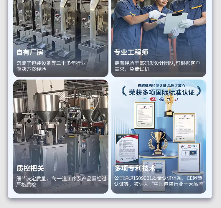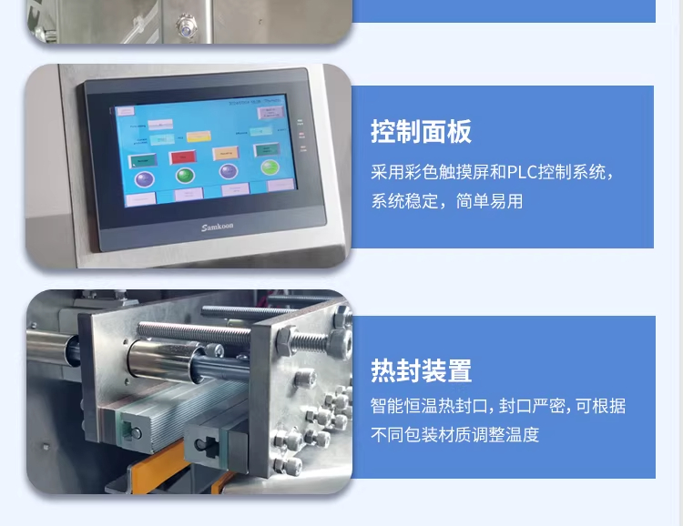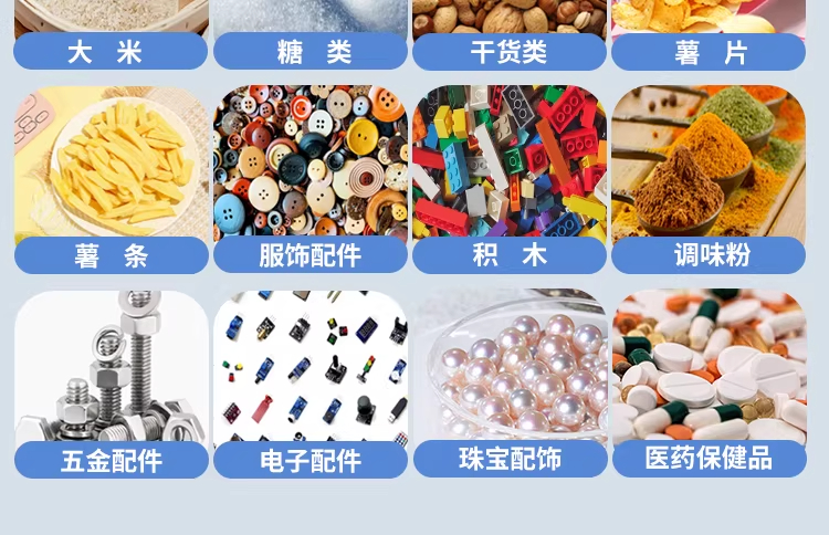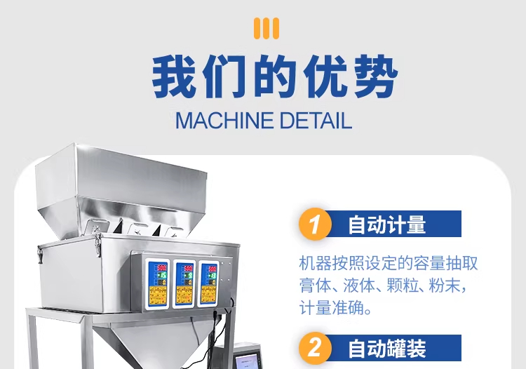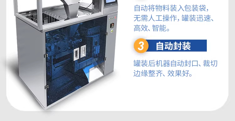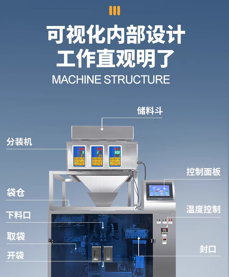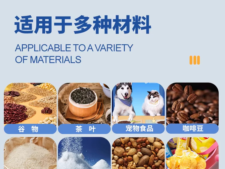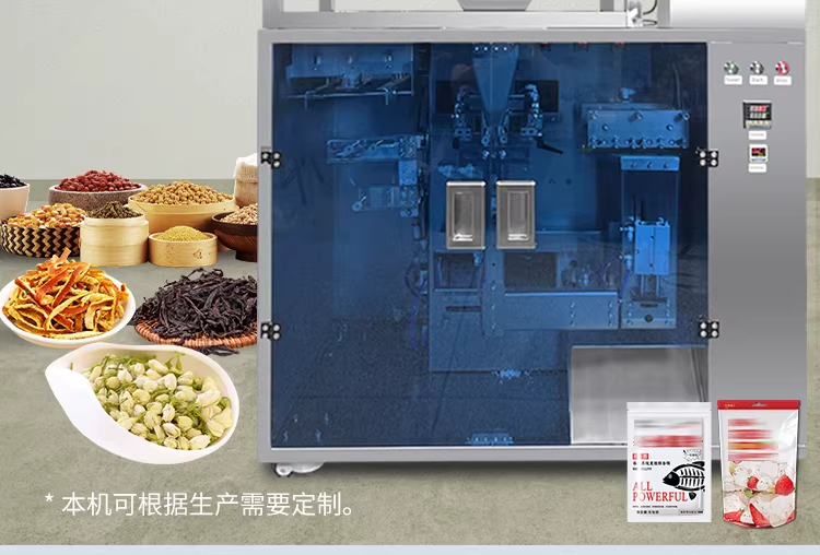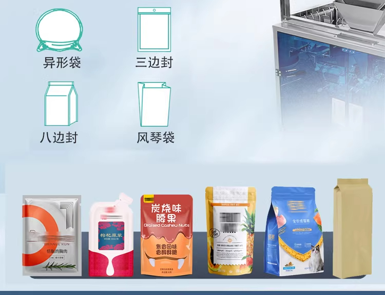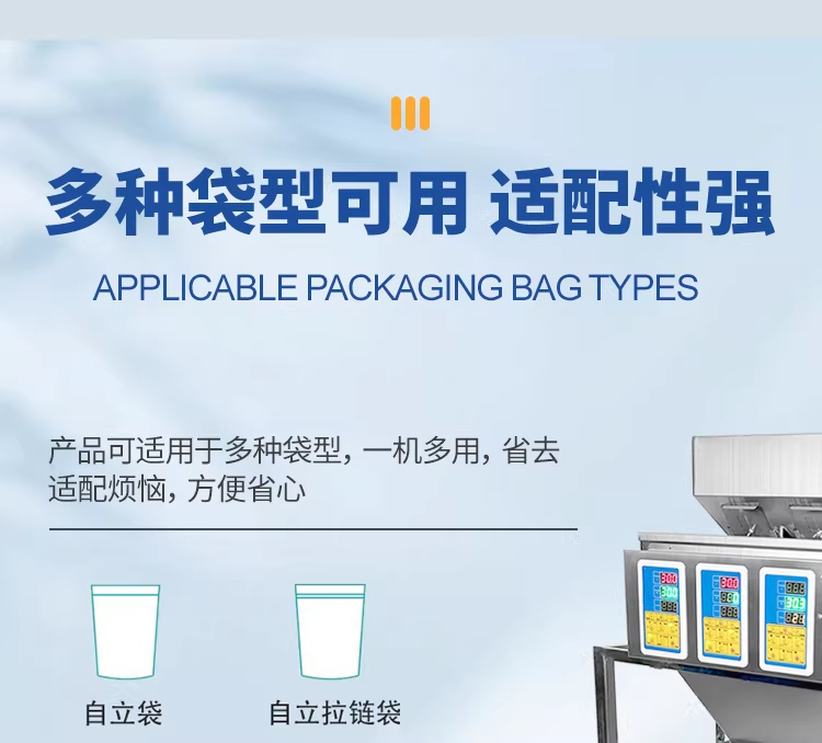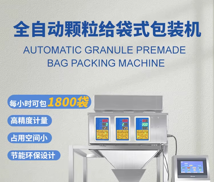 捷鼎公司生产的3头1-100克颗粒给袋式包装机,适用于:适用于茶叶茶末、红茶绿茶、大米小米、玉米花生、绿豆黄豆、蔬菜种子、薯条兽片、爆米花零食、坚果干货、猫粮狗粮、化肥饲料、五金配件、电子元件、等干燥的颗粒、条状、片状类产品的定量、称重、装、封口。机器适用于各种类型的袋装,例如:立式拉链袋、平口袋、八边封袋、风琴袋、异形袋等,袋子的大小可以调节最小尺寸10*12cm,最大尺寸20*30cm