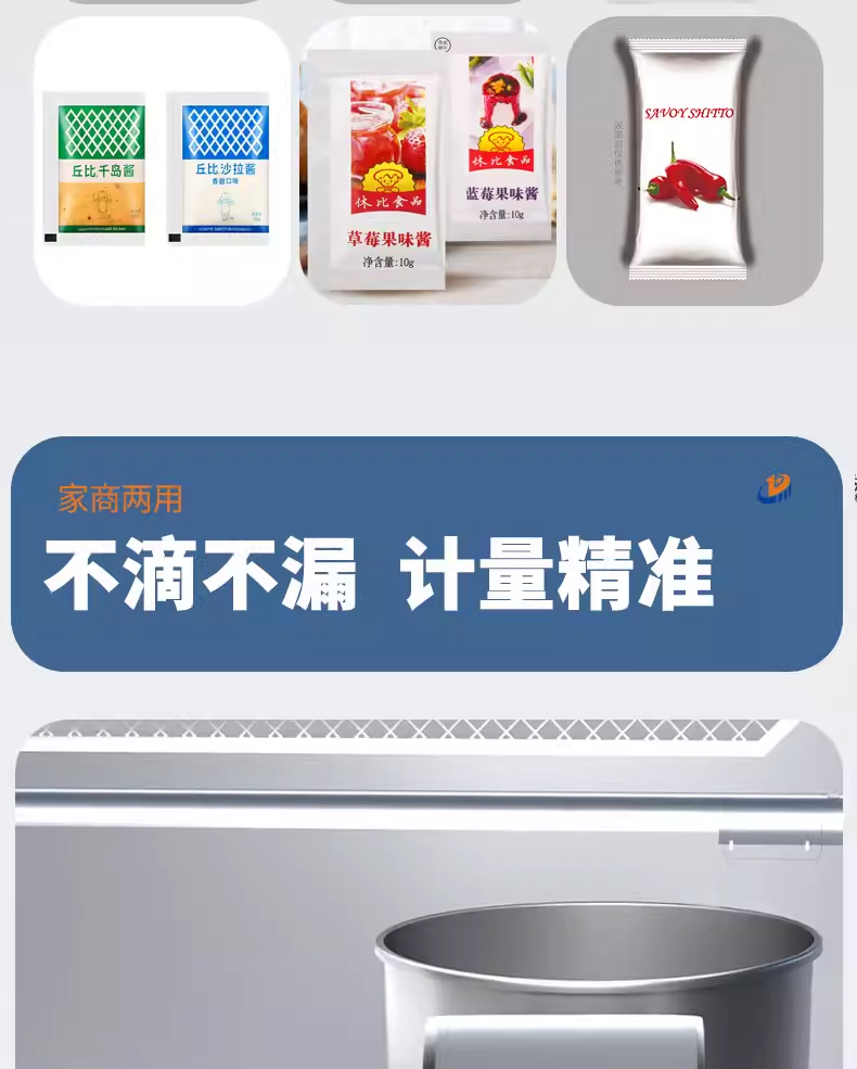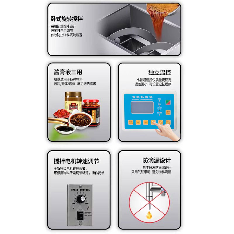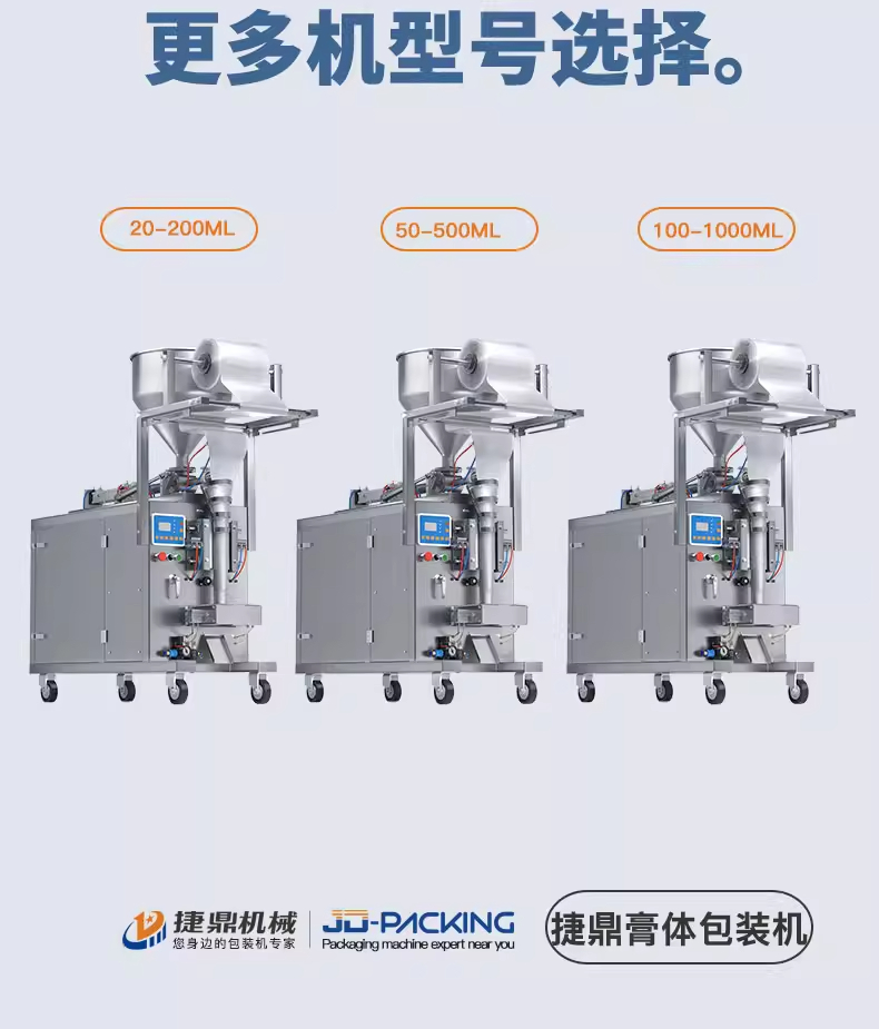 捷鼎生产的20-200ML气动膏体包装机适用于纯净水、牛奶、果汁、酱油,食用油、橄榄油、酒精药水、谳料水、红糖水、辣椒油、火锅底料、番茄酱、花生酱、芝麻酱、咖哩酱、黑胡椒酱、辣椒酱、蜂蜜、枇杷膏、沙拉酱、水果酱、药膏等液体,膏体,酱料、混合料等产品的定量、称重、灌装、包装、封口。